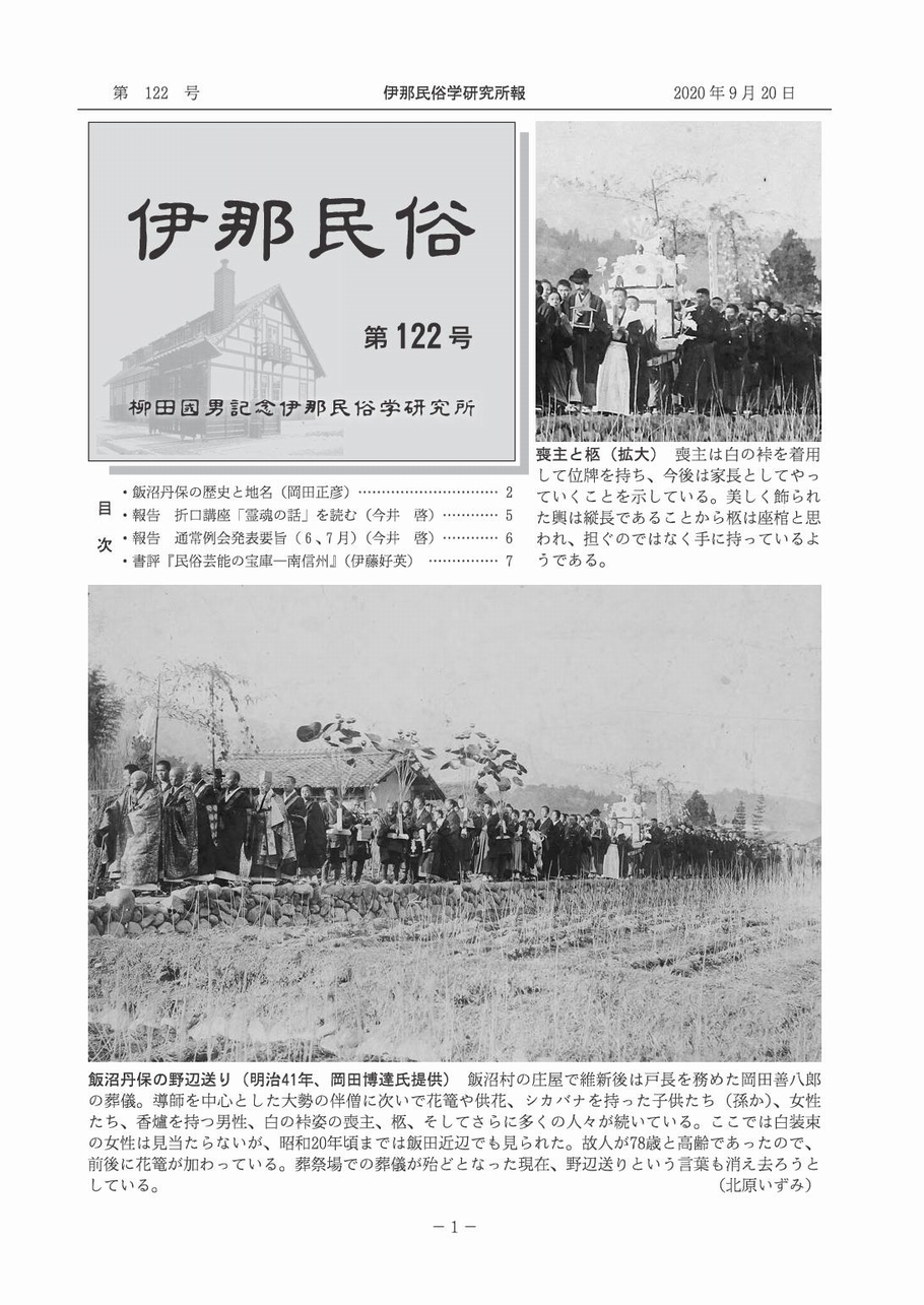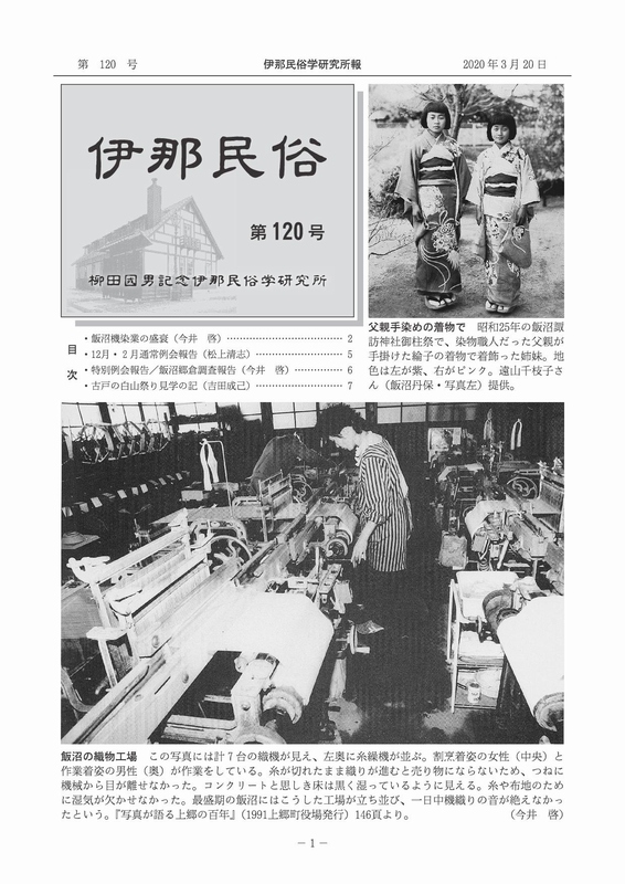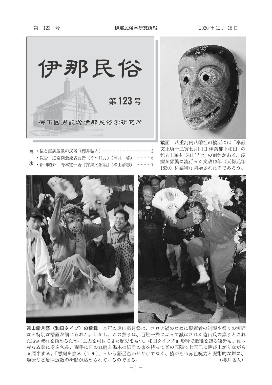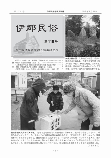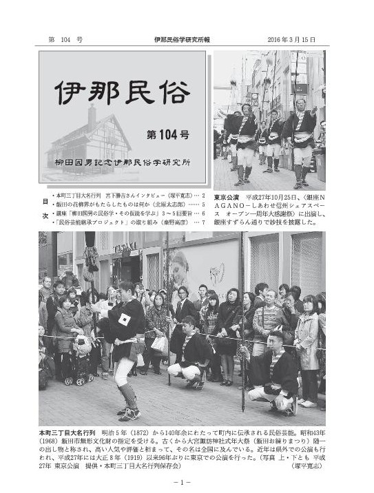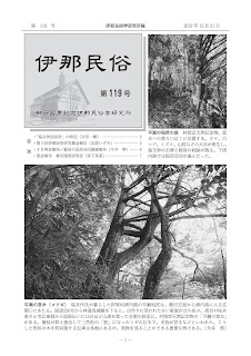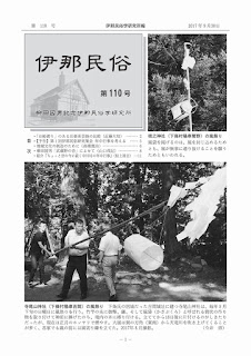 - 当研究所は所報『伊那民俗』を年4回発行しています。伊那谷および三遠南信地域の民俗や柳田國男研究についてのレポート、研究所の活動報告を掲載しているほか、会員相互の情報交流にも活用されています。