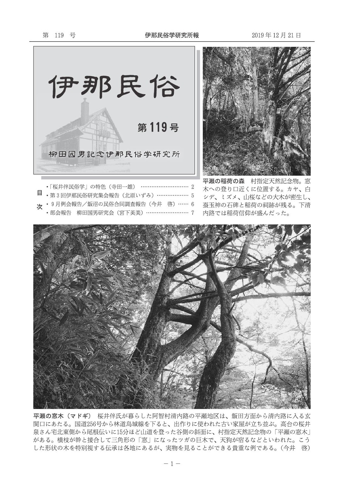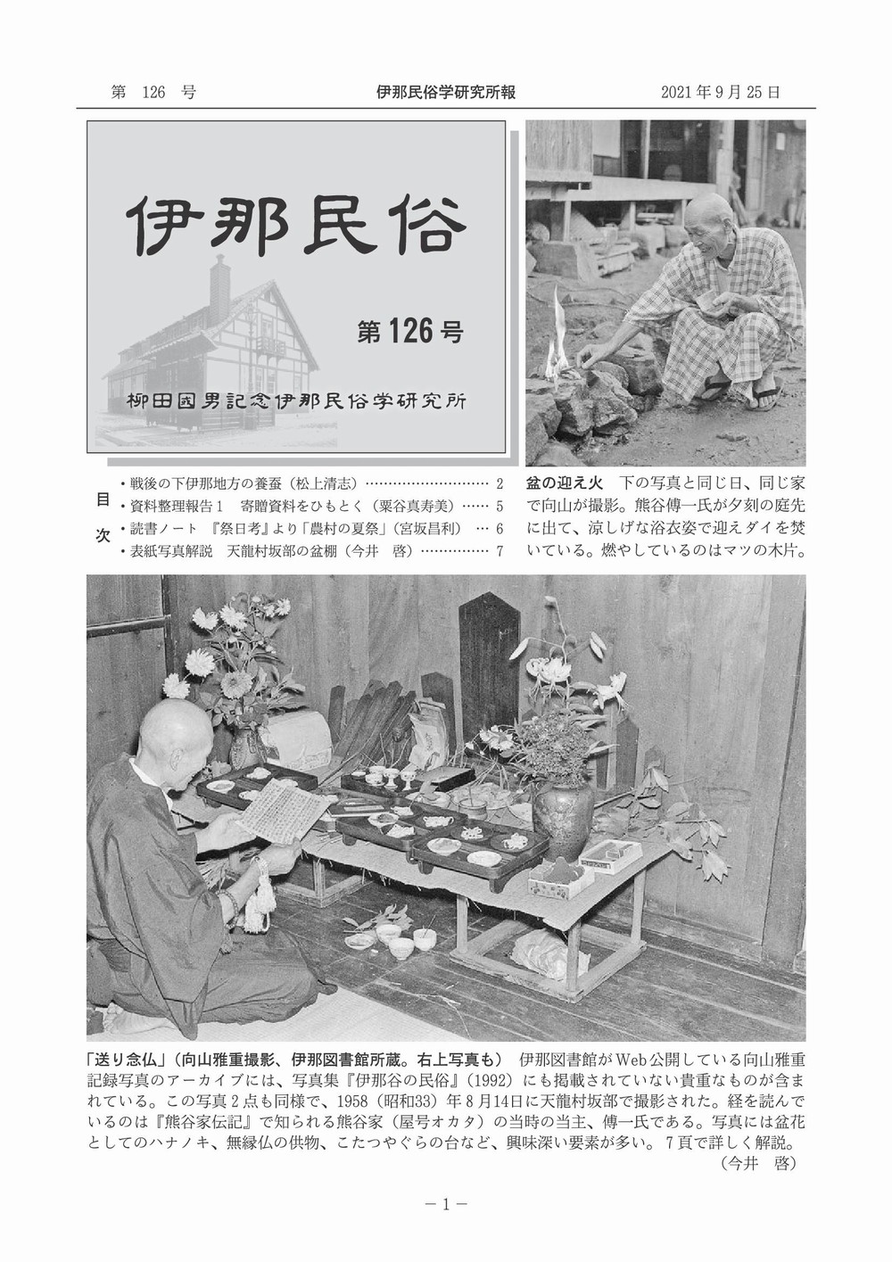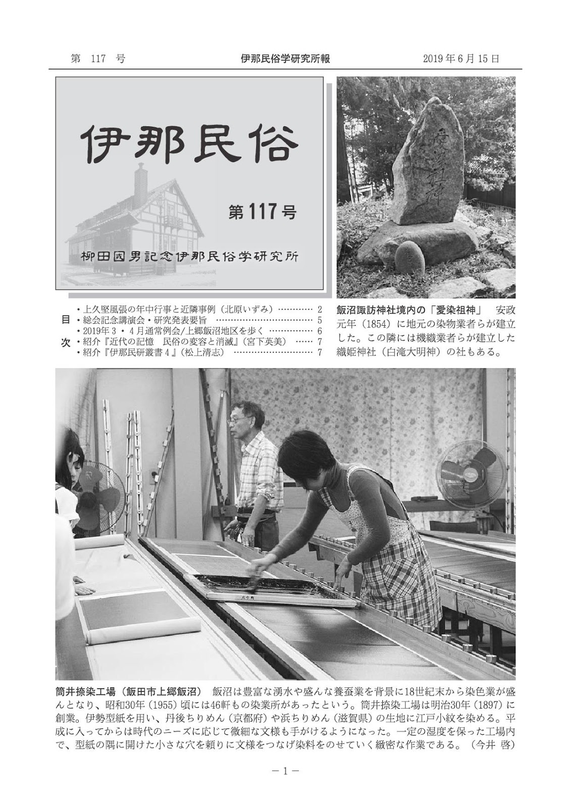 - 当研究所は所報『伊那民俗』を年4回発行しています。伊那谷および三遠南信地域の民俗や柳田國男研究についてのレポート、研究所の活動報告を掲載しているほか、会員相互の情報交流にも活用されています。